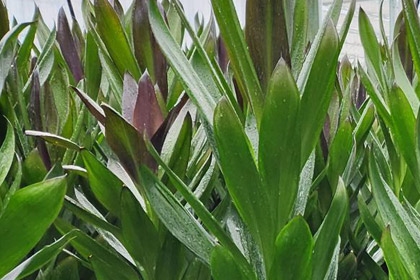 The Cordyline Showoff exudes a tropical vibe with its glossy, lush foliage. The leaves are predominantly green with purple-tinged tips and have a distinctive, strap-like shape. It has an upright growth habit, and is a smaller variety of Cordyline, lending itself to narrow spaces.